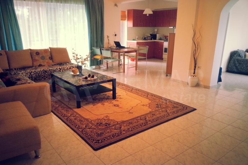 Предлагаемая квартира расположена на первом этаже. Ее площадь составляет 100 м2. Состоит из просторной и светлой гостиной, совмещенной с кухней, двух спальных комнат и ванной комнаты.